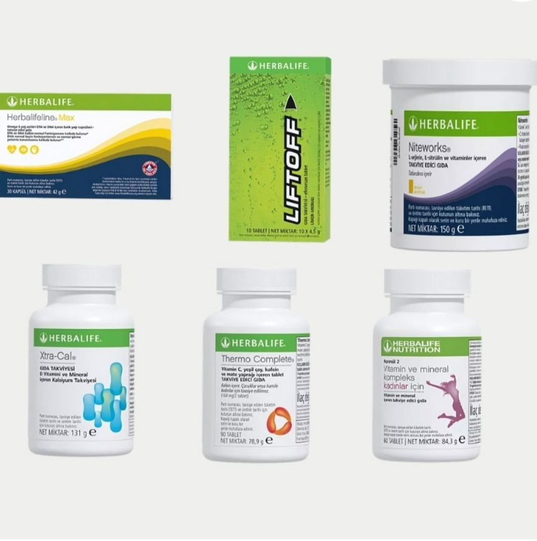 1 adet liftoff limon aromalı  1 adet herbaline max omega 1 adet niteworks 1 adet xtra-cal 1 adet thermo complate 1 adet vitamin(kadın-erkek sipariş notunda belirtebilirsiniz)